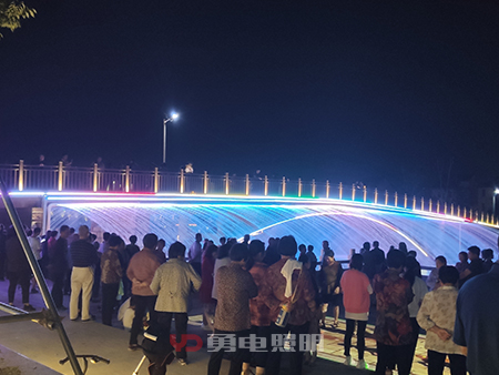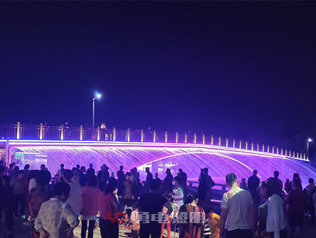 大橋兩側(cè)噴泉瀑布隨著五顏六色光的變化